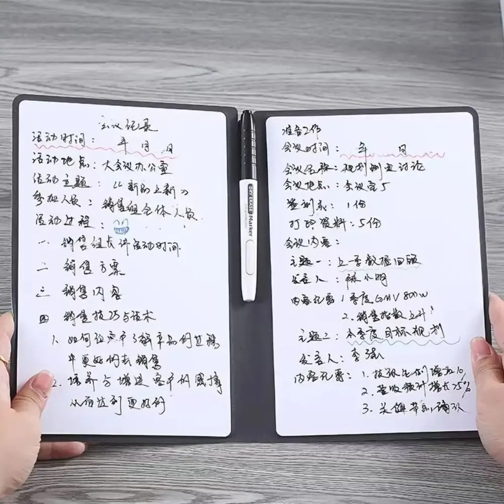 • Notebook Set :The set includes a whiteboard notebook, a whiteboard pen, an erasing cloth, and a leather memo pad, offering a complete solution for your office needs.