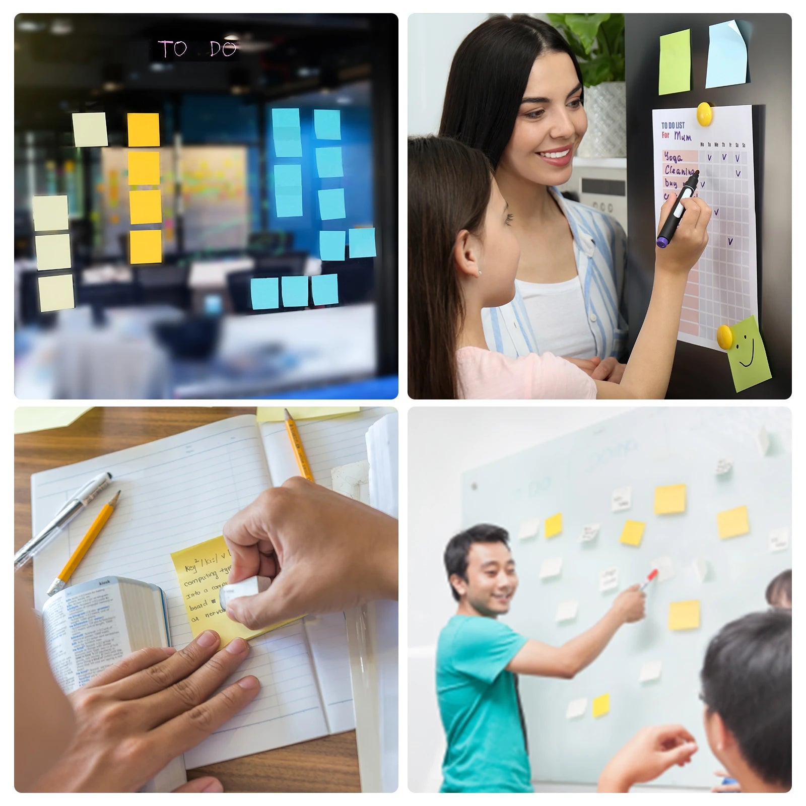 Sticky notes are good for writing memos, reminders, or daily matters, leaving a message to friends, recording important information, numbers, etc. It can be pasted on walls, doors, computers, desktops, refrigerators, and almost all other smooth surfaces. Widely used in offices, family, etc.