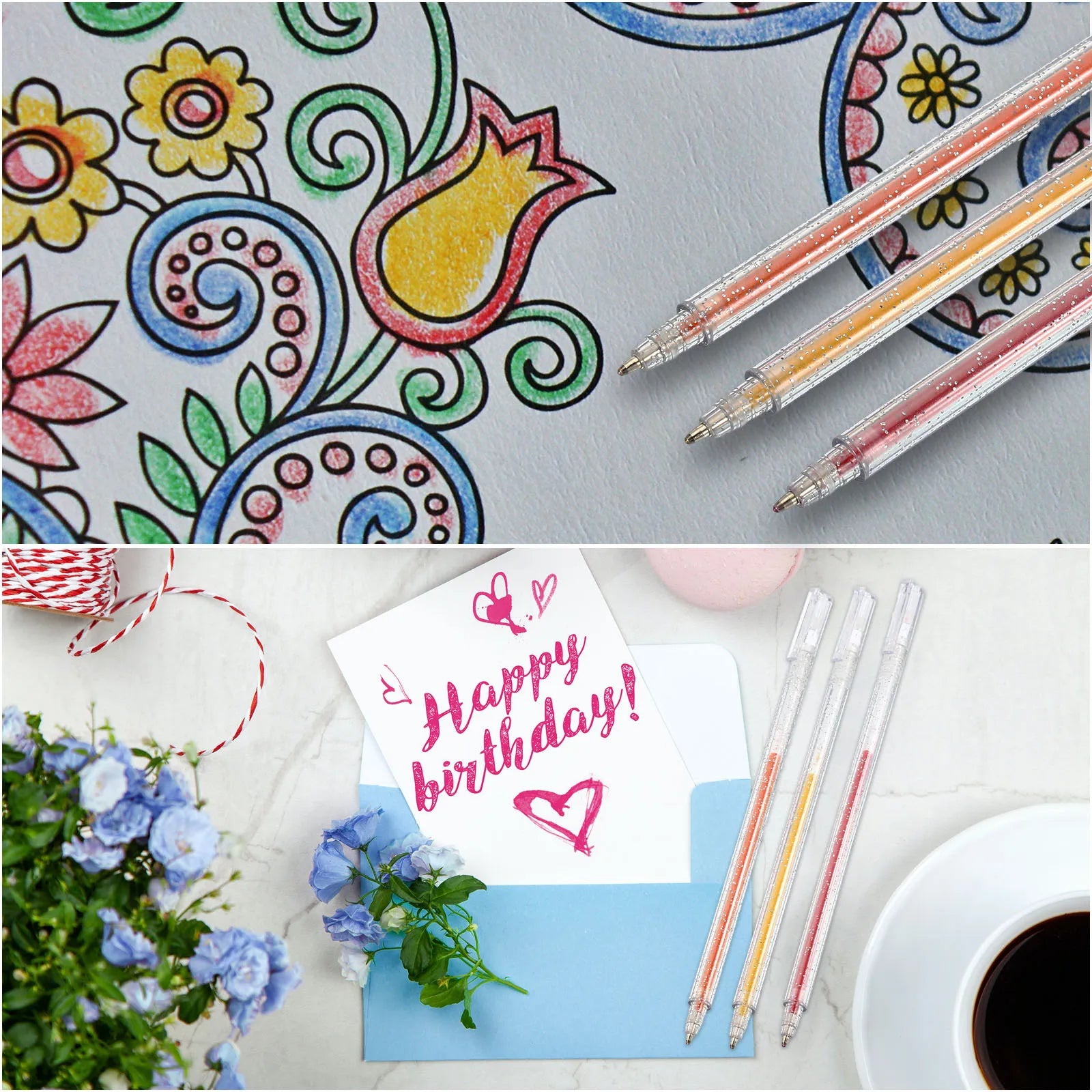 The colored metallic glitter gel pens are suitable for painting, coloring books, scrapbooks, doodling, decorations, craft card making, etc., marking the highlights and adding extra color and fun to DIY creation and writing.
