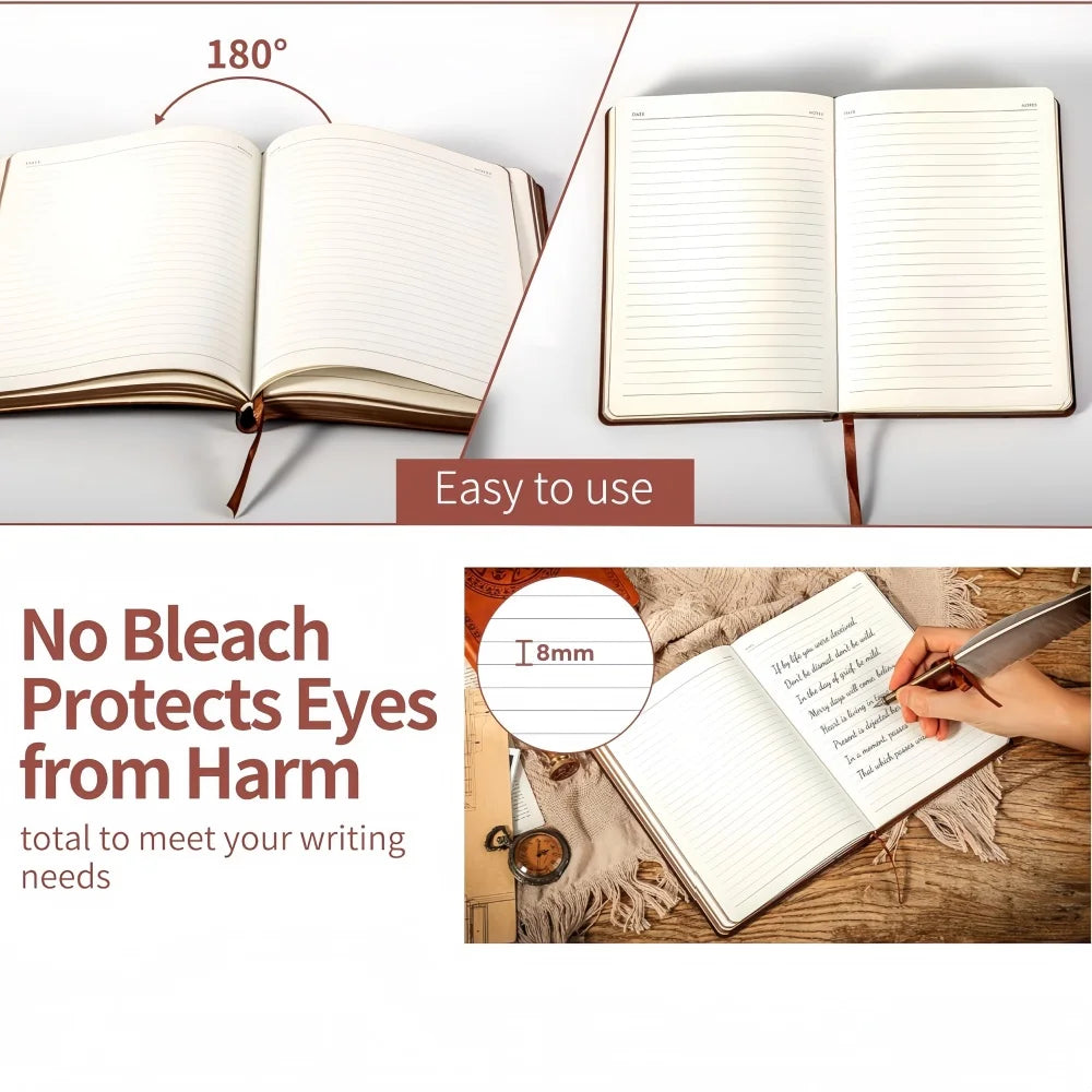 Inner lining paper - This leather soft cover diary has 144 sheets/288 pages with inner lining paper; The rounded corners of the paper can protect the diary from bending. It can be laid flat at 180 degrees, providing the pleasure of writing. Use 80gsm waterproof paper to ensure a high-quality writing experience.