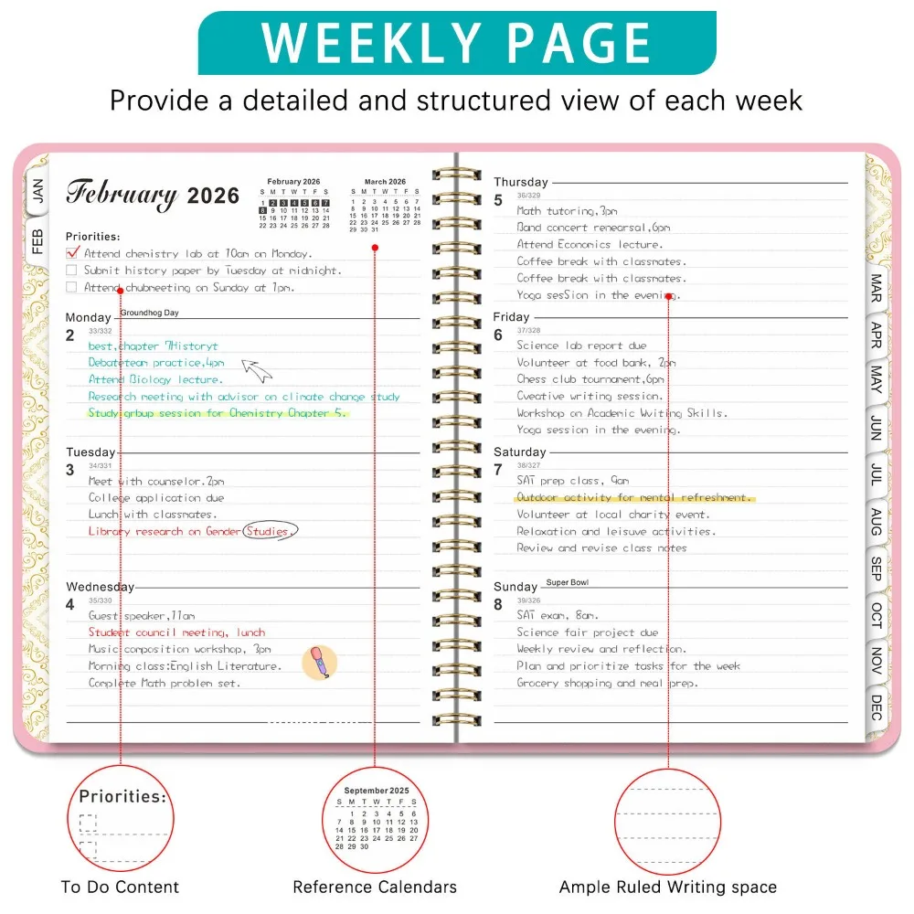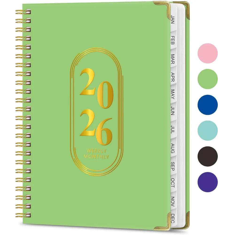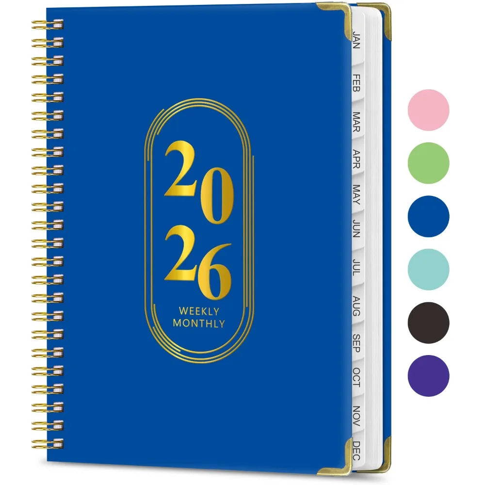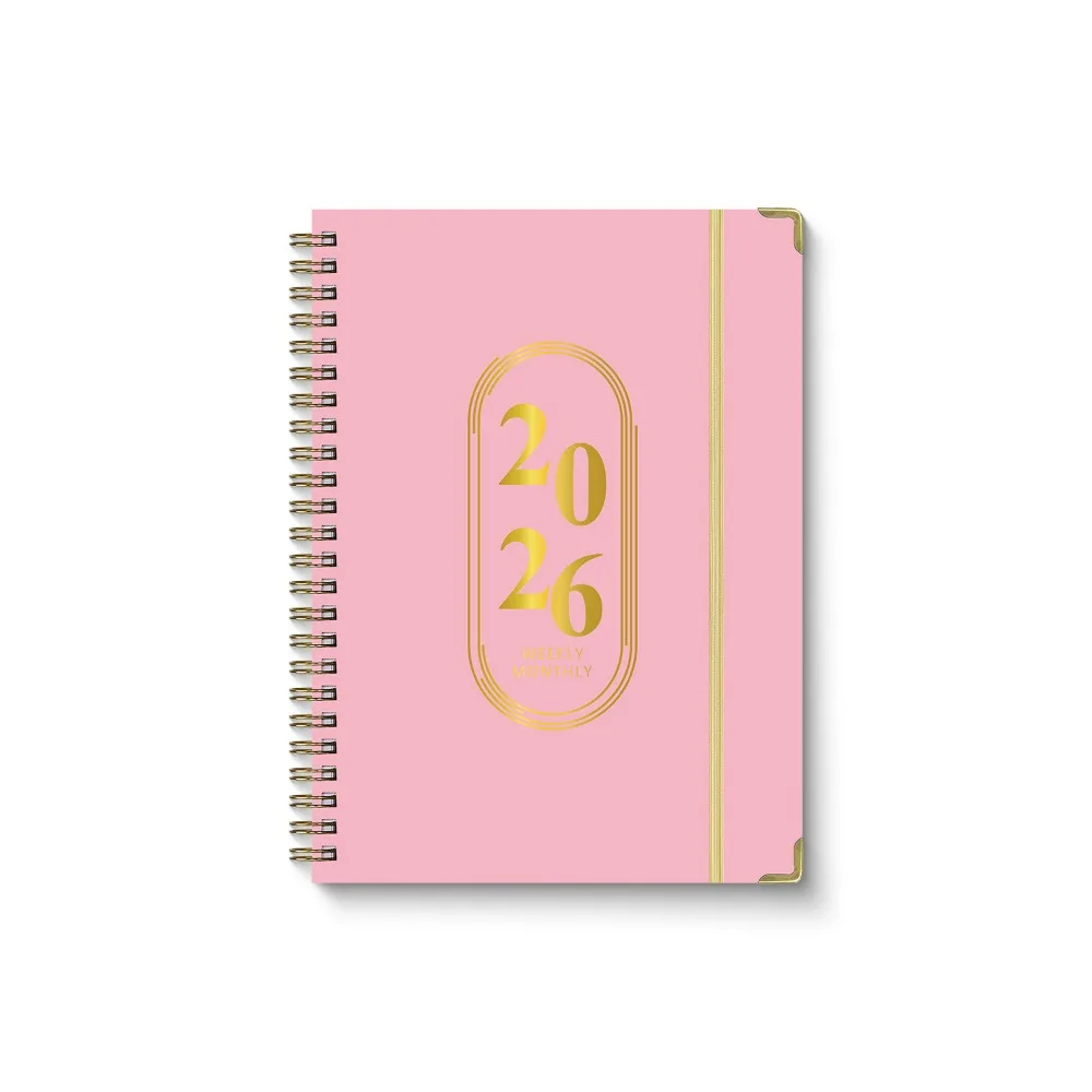 This A5 notebook features a pearl finish cover with durable spiral binding and an elastic closure band for portability and protection. The fully English pages include dedicated sections for schedule planning, work notes, and exercise tracking to systematically manage time and tasks. With smooth paper for fluid writing, it is suitable for office recording, fitness monitoring, or study organization, combining practicality with a lightweight design.