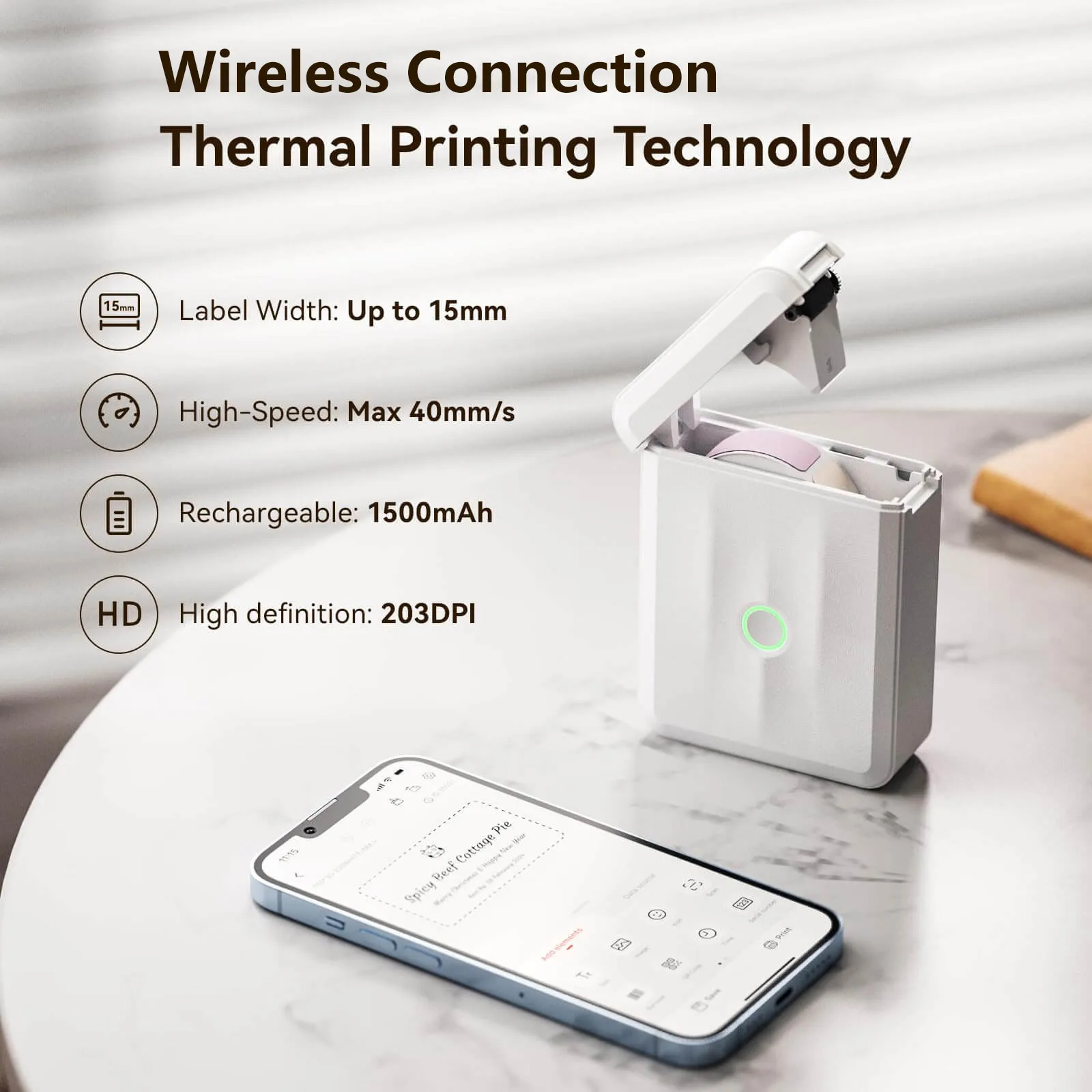 Wireless mini label maker can print within 10-meter away from the smartphone connected by Bluetooth.