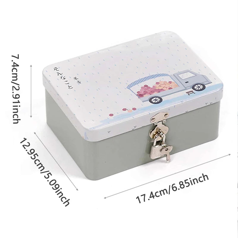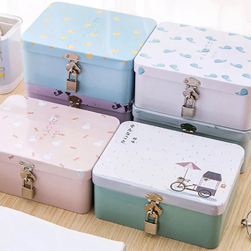 1pc cute Large Capacity Tinplate Box with Lock Key Desktop Storage Case Metal Box Pencil Candy Jar Storage Empty Box