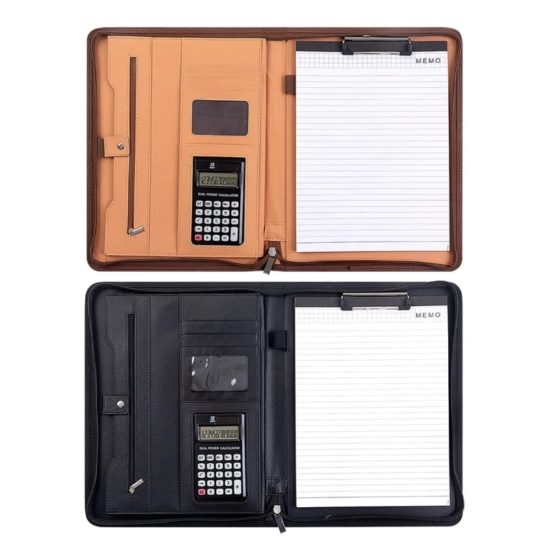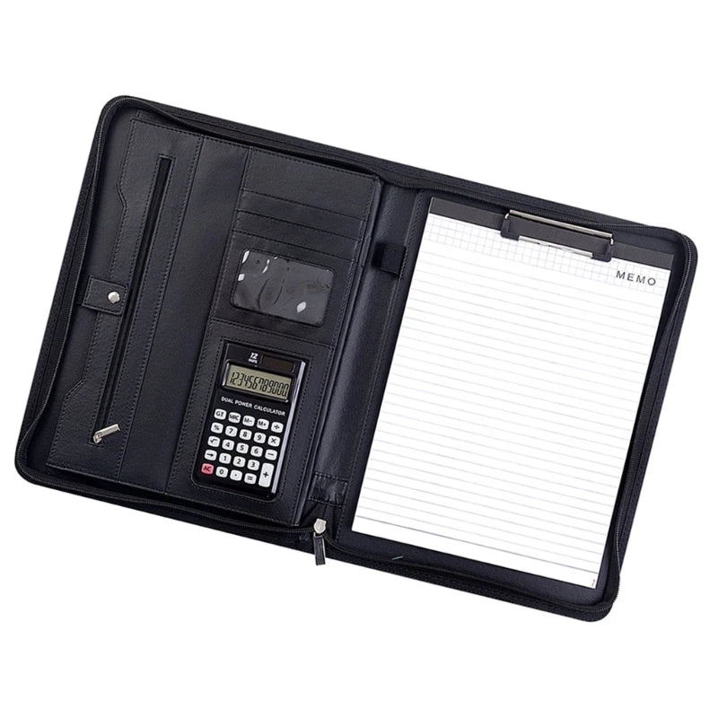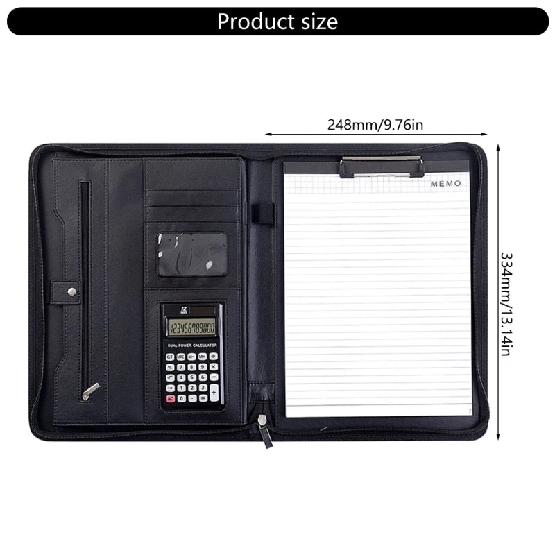 Zippered leather document organiser combines 12 digits calculator with spacious letter size notepads, offering business professional multifunctional conference document organiser case for efficient file paper management and client presentations.