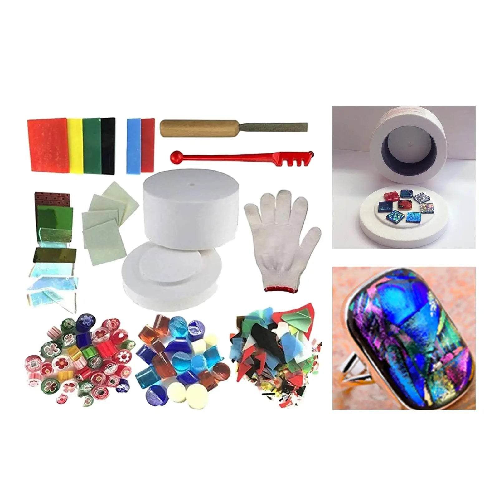 PACKAGE INCLUD: 1 piece kiln, 1 bag round glass (128g), 1 bag coated glass, 1 bag paper glass, 1 bag flower glass , 1 bag glass cutting block, 1 piece glass blade, 1 bag of interlining paper, 1 pair of gloves, 1 piece file.